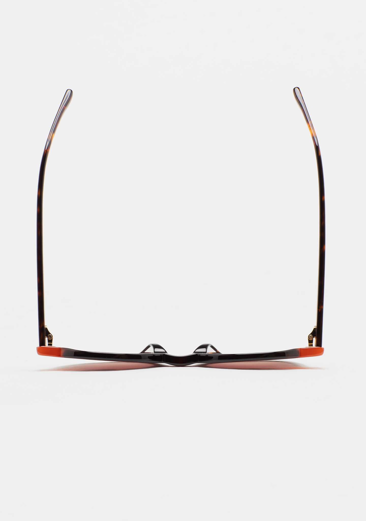 Gafa de sol de forma redondeada. Frontal de acetato havana marrón oscuro con laminado naranja translúcido. Varillas de acetato havana marrón oscuro. Lente marrón degradada base 2 con 100% protección UV y tratamiento anti-reflejante. Lente Categoría 3. Plaquetas de acetato incorporadas. Hecha a mano.